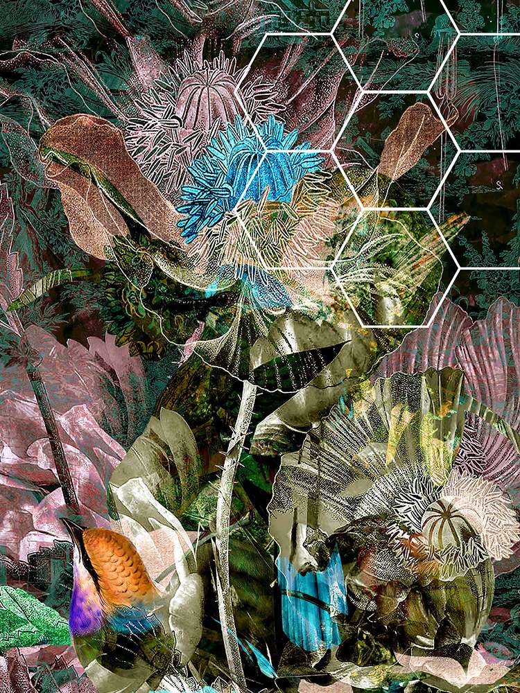 Much of my work is inspired by early landscape, portraiture, and botanical art. Weaving historical imagery into the narrative embeds a feeling of nostalgia, whereas working within a digital platform invites my viewer to consider a new perception of the story. I live on a Sanctuary property, and observing nature every day through the lens, I have begun to notice the cumulative changes in the landscape. There is almost a prehistoric feeling to the geography - vines out of control choking great trees; invasive plants that spill over paths and highways. Trees with weakened root masses are ripped from the ground during storms and left in the aftermath. The natural world is ferocious, rebellious and fascinating.