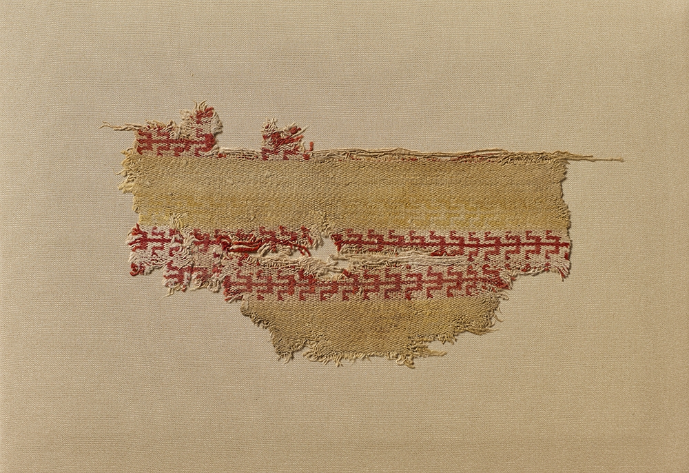 Textile with rosettes, from Dura-Europos, ca. 200–256. Wool; weft-faced tapestry weave, 9 × 12 ½ in. (22.9 × 31.8 cm). New Haven, Yale University Art Gallery, Yale-French Excavations at Dura-Europos, 1933.487. Photo: Courtesy of Yale University Art Gallery.